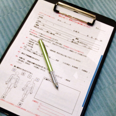 いつ何処で何時頃どの様に痛め何処が痛いか、また健康保険・傷害保険適応、自費治療のみなど詳しく記入して戴きます。
